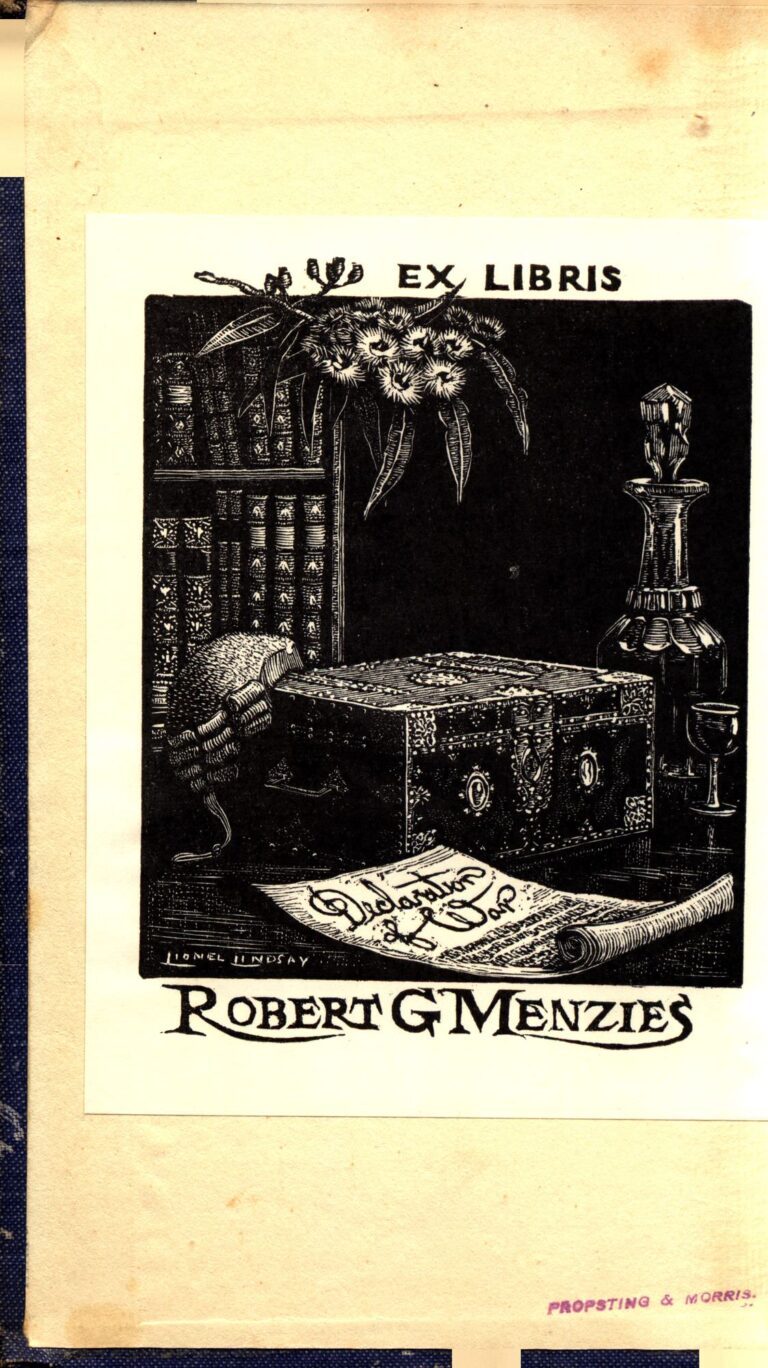 Bookplate inserted; signed in pencil on front endpaper: “Robert G. Menzies”; pp. 166, 169 earmarked.