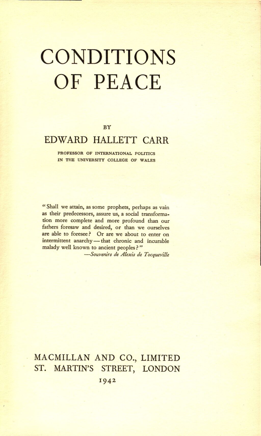 Bookplate inserted; bookseller stamp for Hugh Rees, London inside cover. P. 102 on ‘the Moral Crisis’ earmarked; highlights made in pencil include: [p. 103] “[laissez faire economics] dispensed with the need for a moral purpose to direct such planning. It was “a political theory which replaced the conception of purpose by that of mechanism” […] The nineteenth-century philosophies of Hegel and Marx were typical in their emphasis on the process rather than on the end.”; [p. 109] “The economic machine refuses to run until we discover a new moral purpose to replace the now exhausted and inoperative profit motive as the driving force”; [p. 110] “The essential nature of the crisis through which we are living is neither military, nor political, nor economics, but moral […] the corollary of this neglect of moral purpose in the philosophy of the age which is passing away was a correspondingly exaggerated belief in the supremacy of the intellect […] serious people still imagine [p. 111] that there is a “key” to our economic problem, discoverable by ingenious and studious economists [… Our civilisation is in danger of perishing without] a deliberate and avowed moral purpose, involving the call for common sacrifice for a recognised common good.”; [p. 113] “War is the most powerful instrument in effecting this transformation; and it may serve as an introduction to our enquiry to consider the precise nature of the moral function which war to-day performs in our society.”; [p. 115] “Apart from the emotional excitement associated with war, it provides a sense of meaning and purpose widely felt to be lacking in modern life. Hence war has become the most powerful known instrument of social solidarity. In the advanced countries of the world war or preparation for war is to-day the only moral purpose with the recognised capacity of inspiring the degree [p. 116] of self-sacrifice in all classes of the community necessary to keep the political and economic machine in motion.”; [p. 117] “Communism, like Christianity, has suffered from the short-comings of those who practice it. Its creed has the major defect that, true to the nineteenth-century tradition of Marxism, it expresses itself in terms of a material process rather than of a moral end.”; [p. 118] “The new faith must speak in positive rather than in negative terms, striving for the achievement of good rather than for the avoidance or suppression of evil […] the pursuit of positive goods. To prevent war we must create a new order; to reduce armaments we must build a common pool of armaments for a common purpose; to remove trade barriers we must plan international trade; to cure unemployment we must organise men for the fulfilment of urgent and necessary tasks […] The new faith will [p. 119] make its appeal predominantly to the “little man” – to the unorganised consumer rather than to the organised producer, to the individual of small possessions and no importance who feels himself helpless in the midst of great impersonal organisations dominating the life of the community. It will therefore proclaim its independence of these organisations – of big business, of trade unions and of the great political parties – and aim at the emancipation of society from the vested interests which they have come to represent […] The new faith must restore to the individual, to the “little man”, his sense of being the constituent member of the community, and thus make democracy once more a reality […] The new faith must address itself first of all to the solution of the economic problem [,,,] Man does not live by bread alone. But without it he does not live at all; and there is a real sense in which bread is the first essential element of his moral as well as of his physical welfare.”; [p. 120] “The new faith will approach the unemployment problem […] create work destined to fulfil a purpose felt by the community to be worthy of self-sacrifice […] The new faith will have to revive and renew the ideal of equality”; [p. 121] “The new faith, reversing the nineteenth-century trend, will lay more stress on obligations than on rights, on services to be rendered to the community rather than on benefits to be drawn from it.” [p. 122] “The catchword that “the state was made for man, not man for the state”, legitimate as a protest against the tyranny of totalitarianism, must not be used to cover a denial of social obligation.”; [p. 123] “Just as the social problem is complicated by the one-sided emphasis on the rights rather than on the obligations of the individual, so the international problem is complicated by an exclusive recognition of the nights of nations.”; [p. 164, concerning systems of world organisation] One popular approach is to plunge immediately into the elaboration of some constitutional framework for the whole world or for whole continents – a federation, a revived League of Nations, a “United State of Europe” – to be set up by agreement at the end of the war. There is a kind of native arrogance in the assumption that the problem of the government of mankind, which has defied human wit and human experience for centuries, can be solved out of hand by some neat paper construction of a few simple-minded enthusiasts.”; [p. 165] “But those who contemplate a revival of the League of Nations in substantially its previous form, with a few modifications designed to “strengthen” it, are open to the same condemnation as the proponents of Federal Union.”; [p. 166] “[The new and broader commonwealth of nations can only be built] up out of some such network of relationships, flexible in character and inspired by no undue itch for uniformity, to which it may some day be possible and convenient to give a more precise legal shape.”; [p. 169] “[The most distressing and unsatisfactory feature of British foreign policy between the two wars] – its failure to establish a