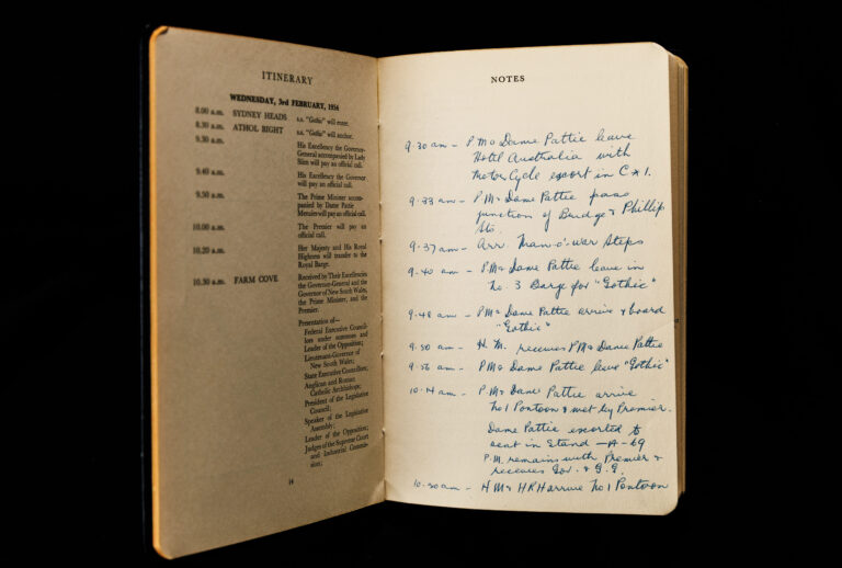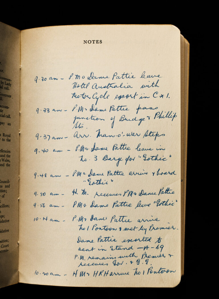 [15] “9:30am – P.M O Dame Pattie have Hotel Australia with motorcycle escort in C * 1. 9.33am – P.M. Dame Pattie pass junction of Bridge and Phillip Sts. 9:37am – arr. Man-O-War steps. P.M. & Dame Pattie leave in no. 3 barge for “Gothic”. 9.48am – P.M. & Dame Pattie arrive and board Gothic. 9.50am. H. M. [Heather Menzies] receives P.M & Dame Pattie. 9:56am P.M & Dame Pattie leave “Gothic”. 10.14am – P.M & Dame Pattie arrive no 1 pontoon & met by Premier. Dame Pattie escorted to seat in stand – 14 – 69 P.M. remains with Premier & receives Gov & G.G. 10.30am – H M & H R H arrive no 1 Pontoon. [p. 17] 11am – Royal Progress begins. P M & Dame Pattie & Heather are escorted to Pontoon & leave no 3 barge for Admirality House. pm – Lunch Admirality House with G G & Lady [indecipherable]. Return by barge to Man-O-War steps. C * 1 Motorcycle escort waiting at Man-O-War steps. 7 for 7.30 – Dinner in Honour of Queen, Govt House, Sydney, by H & the Governor and [indecipherable] (P.M & Dame Pattie). 7.15pm Ferry leaves Manly Wharf for fireworks (Miss Menzies).”Related entries