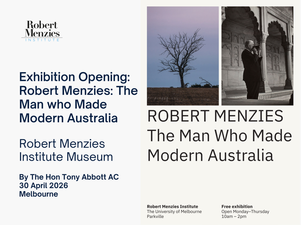 The Robert Menzies Institute invites you to the opening of its major new exhibition ‘Robert Menzies: The Man who Made Modern Australia‘. The exhibition will be opened by former Prime Minister The Hon Tony Abbott AC.