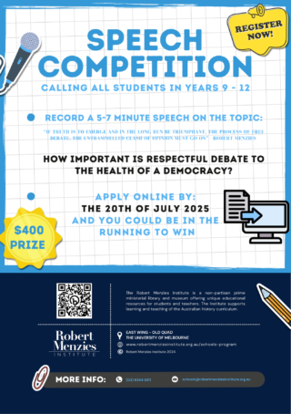 The Robert Menzies Institute Speech Competition is a program for secondary students in Australia to practice oratorical skills in a speech relating to the legacy of Australia’s longest-serving Prime Minister, Sir Robert Menzies. Robert Menzies was well-known for his powerful speeches, including the Jefferson Oration, delivered on US Independence Day at Monticello, Charlottesville, Virginia in 1963. Sir Robert Menzies spoke often of the importance of a good speech: “Aim at simple, clear speech, and if you aim at that and achieve it, you will find that this will make a very great difference right through your lives.”