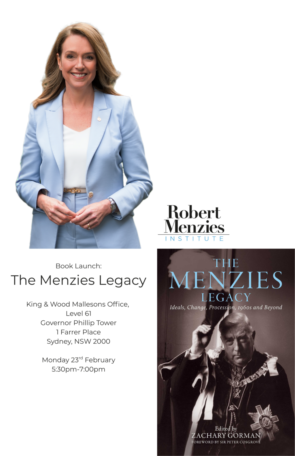 We are honoured to announce that Kellie Sloane MP, Leader of the Opposition, Leader of the NSW Liberals, and Member for Vaucluse, will officially launch The Menzies Legacy. Kellie will share her reflections on the work and discuss how its themes resonate with a contemporary vision of the Liberal Party.