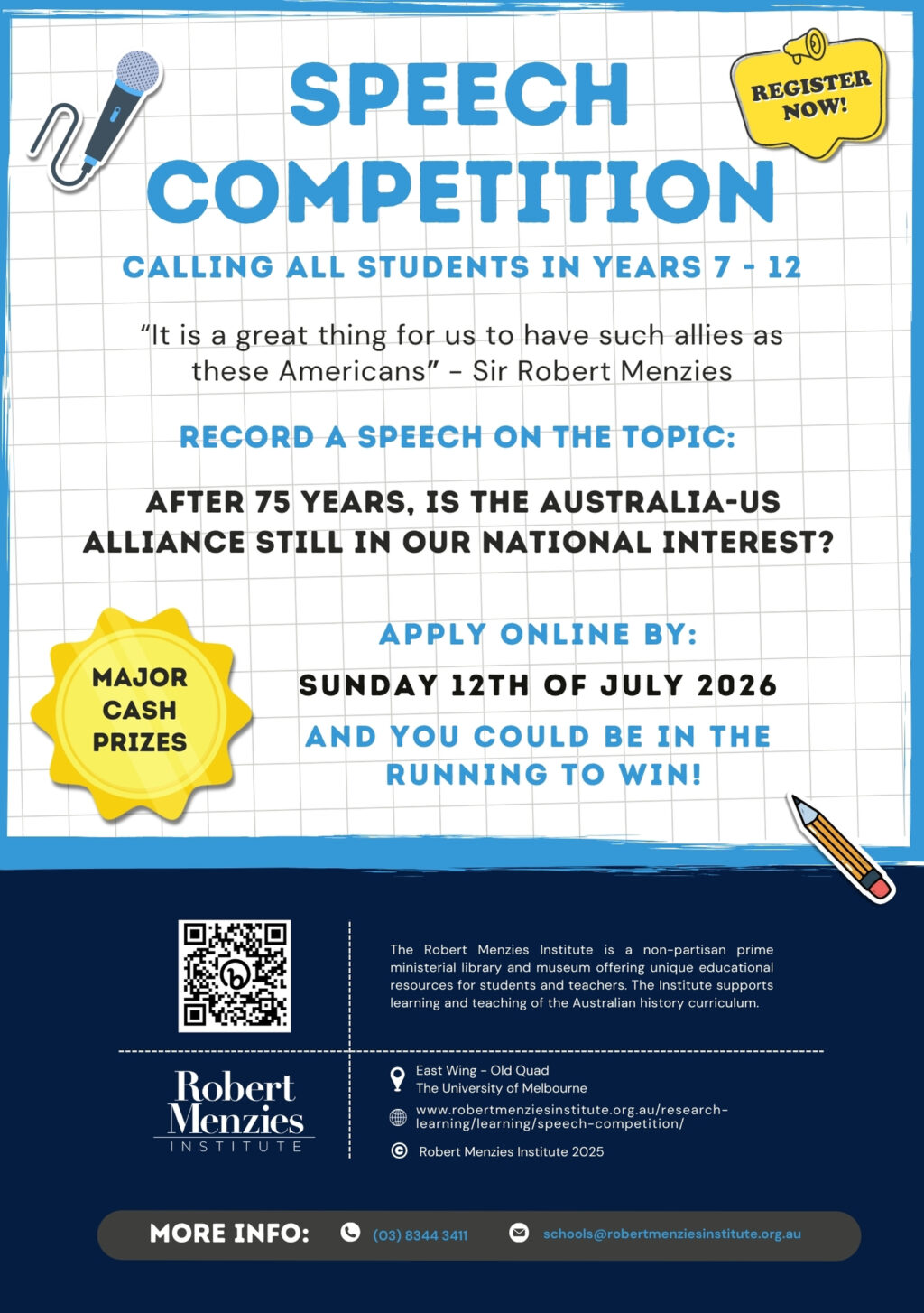 Each category winner will also receive an invitation to deliver their speech at the Robert Menzies Institute Annual Conference in November 2026.